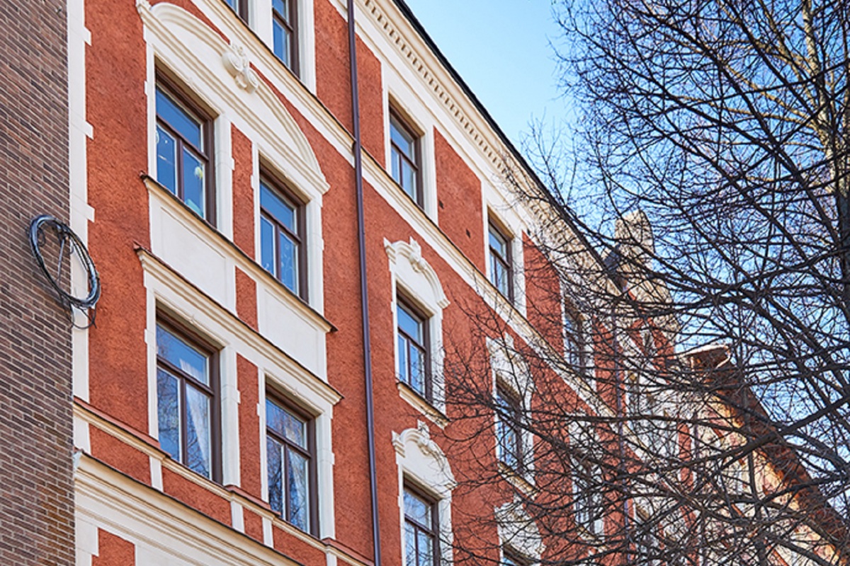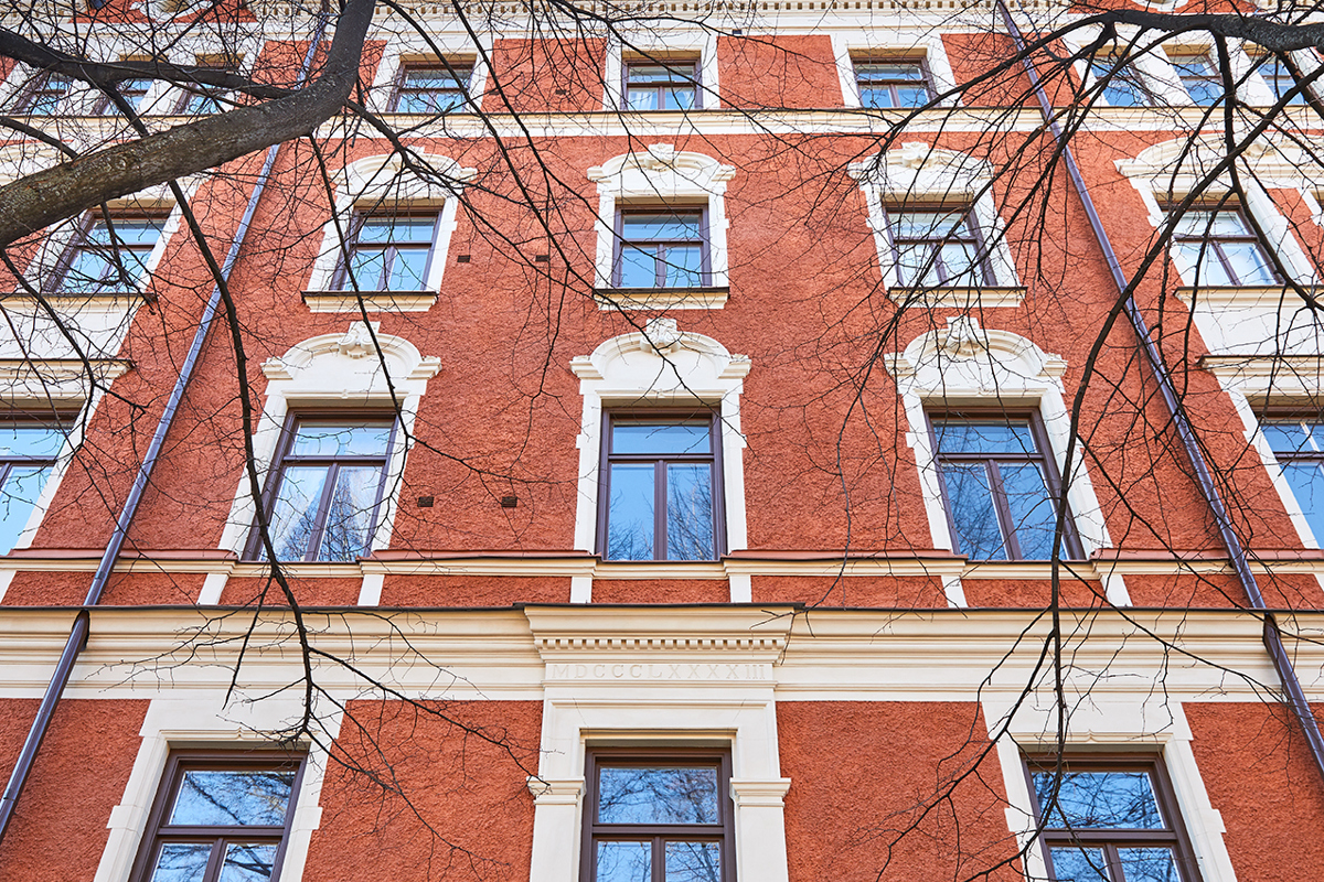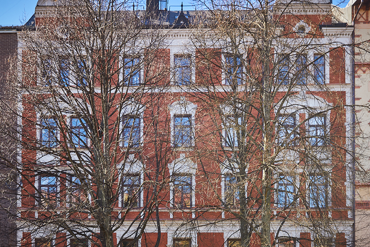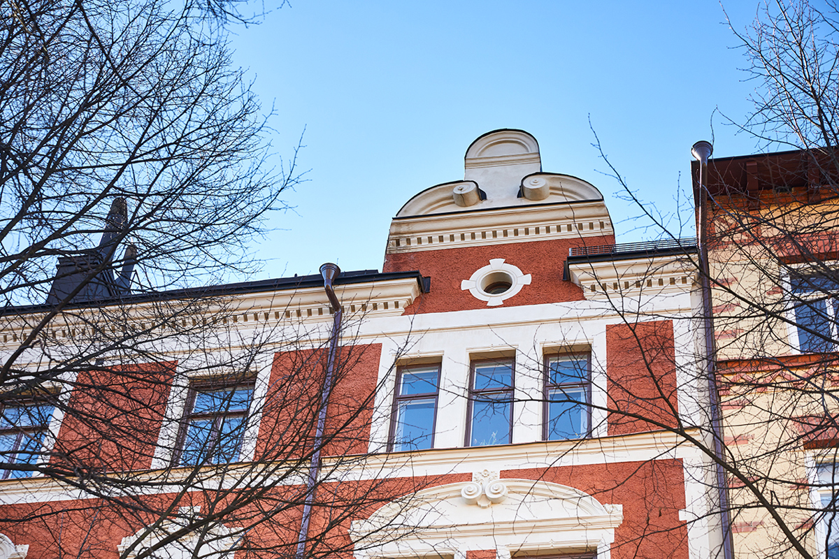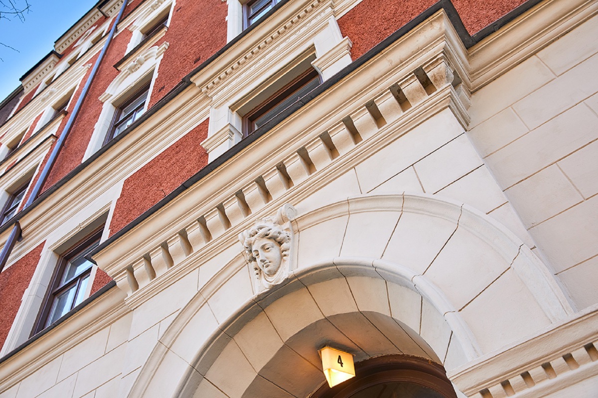 Beskrivning: Fasadrenovering, där listverk och ornament har lagats och målats om.